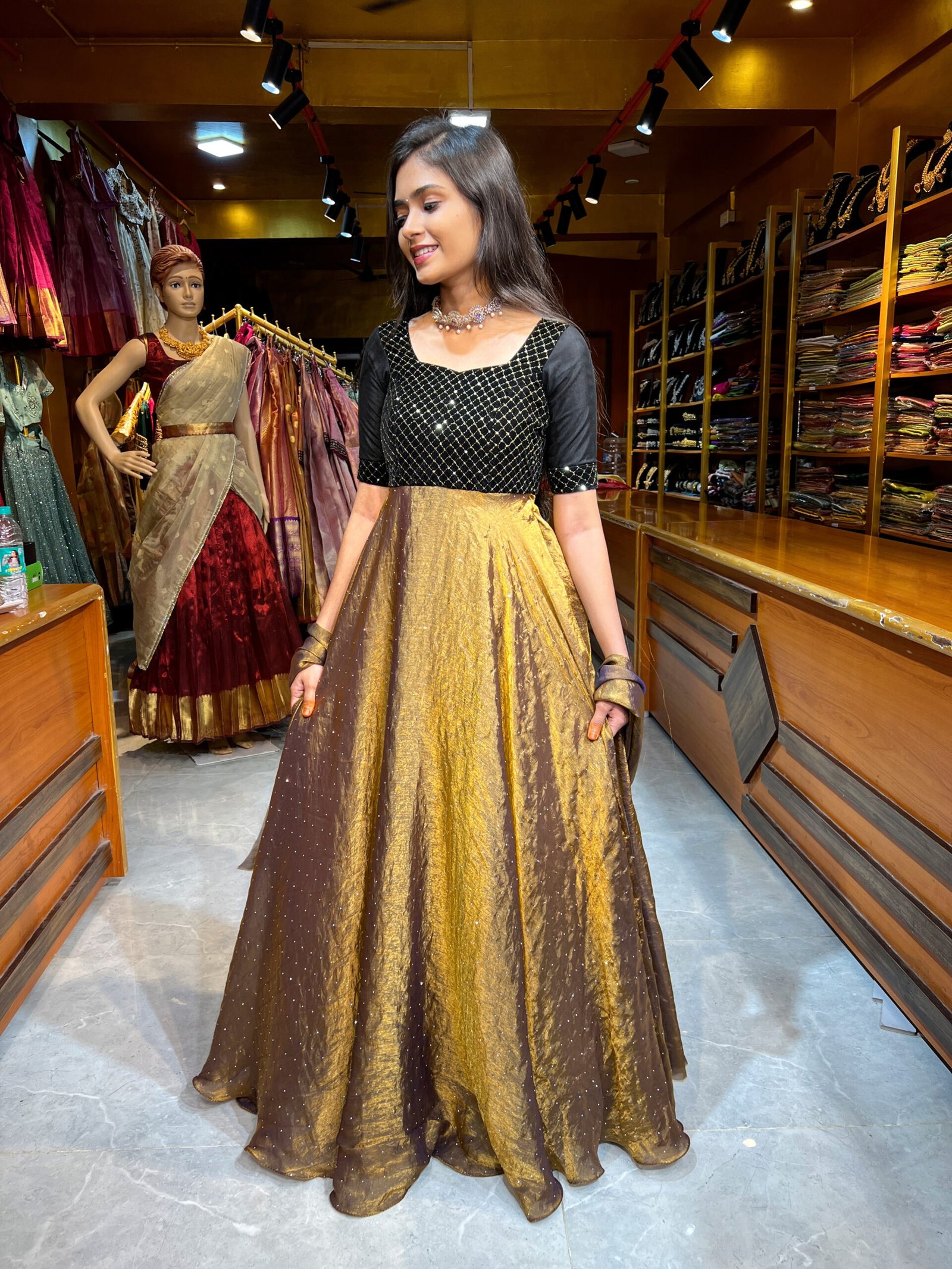 Maxi : Black Sequence Embroidery yoke part paired up with Metallic Gold Space Silk .