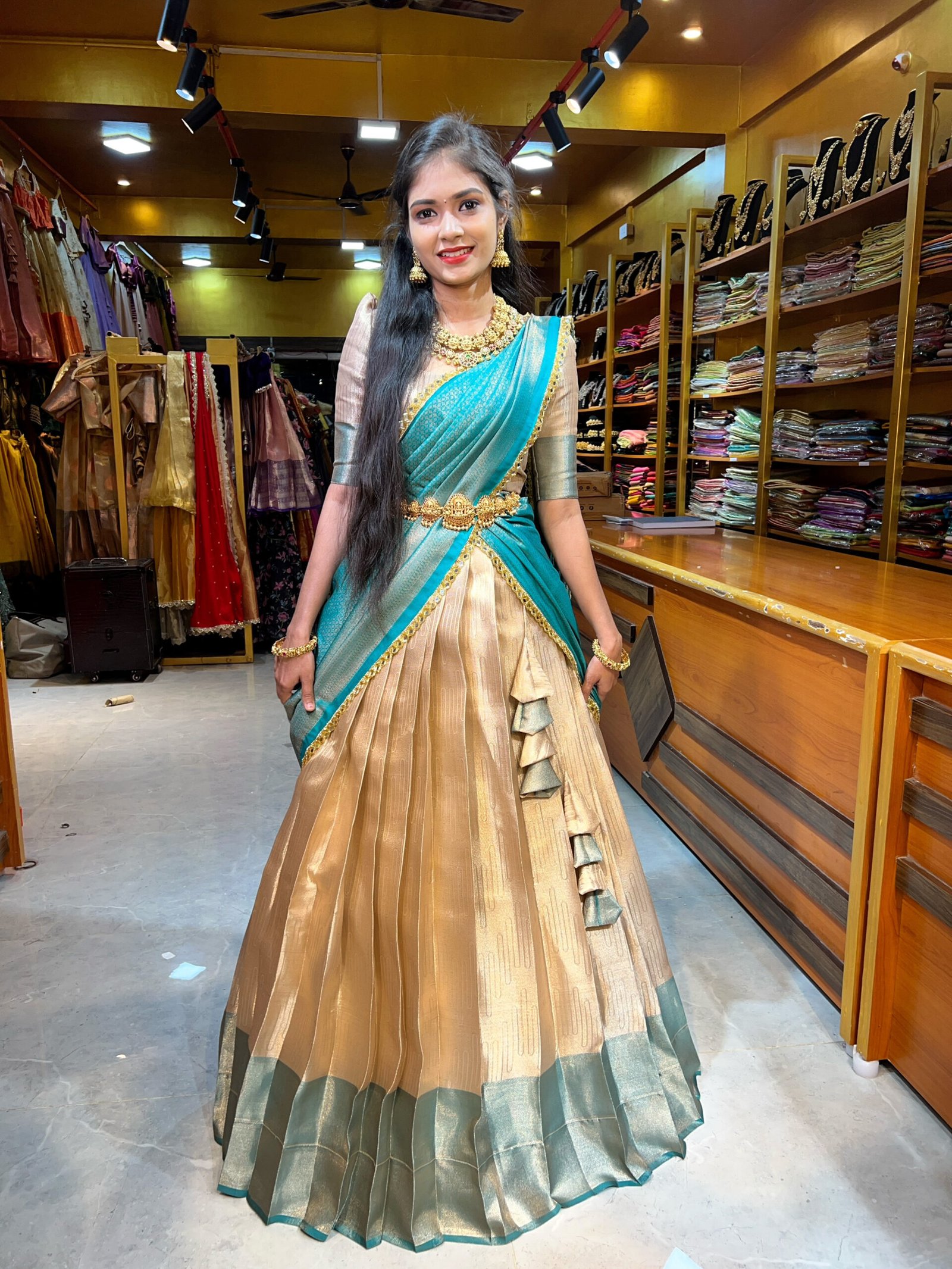 Be the first to review “Cream Silk Tissue with Sea Green Half Saree”