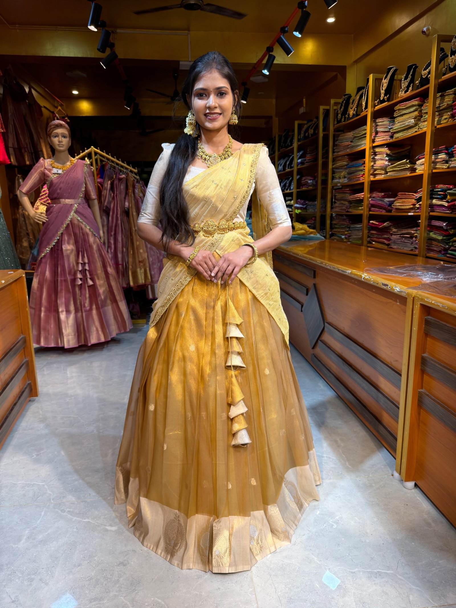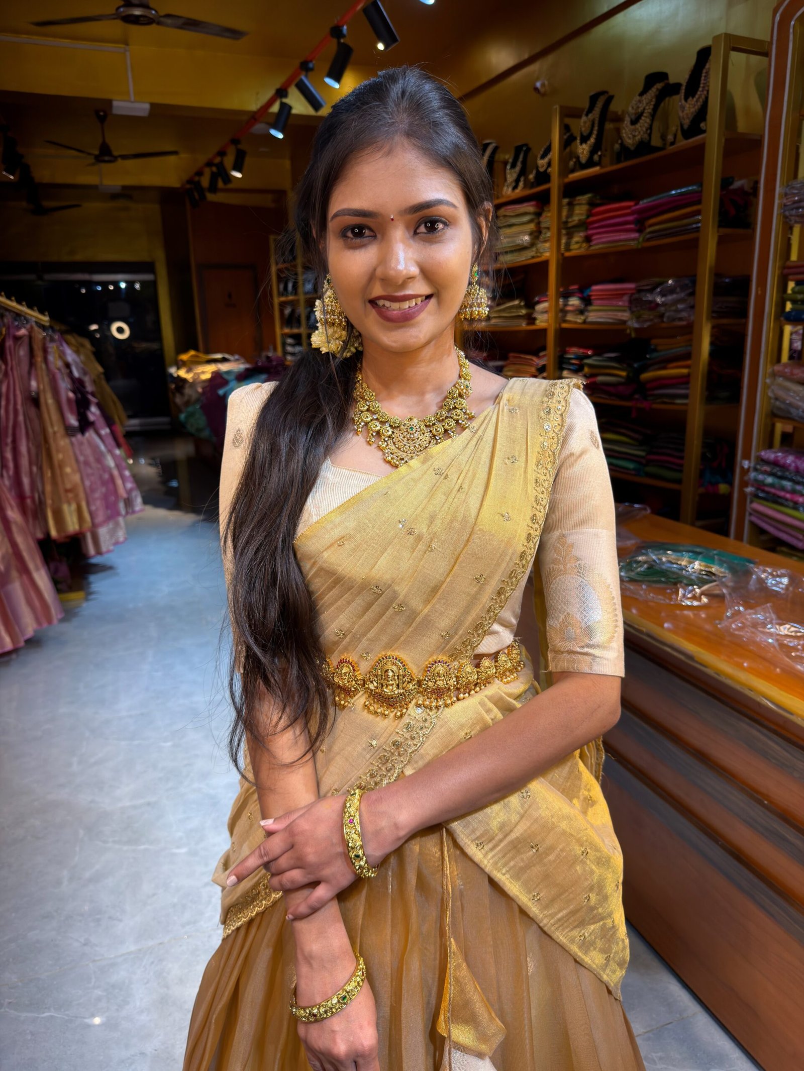 Be the first to review “Gold with Off White Tissue Silk Half Saree”