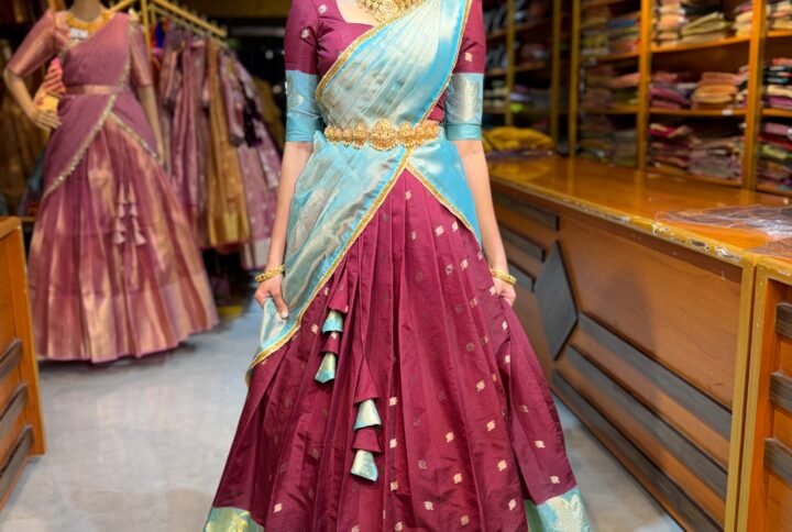 Half saree : Gold silk Tissue Silk skirt paired up with Contarst blouse perfected with boutique tailoring