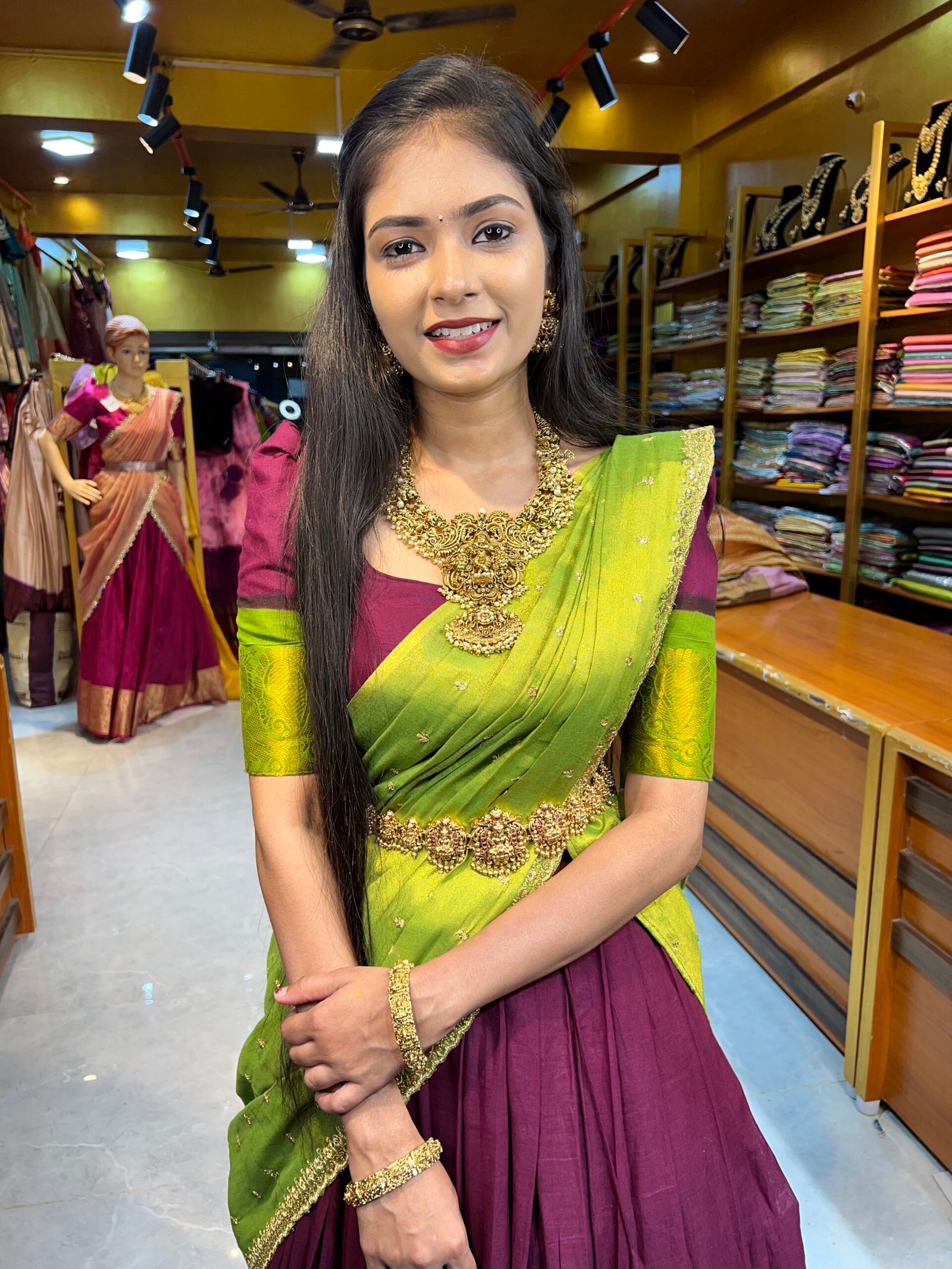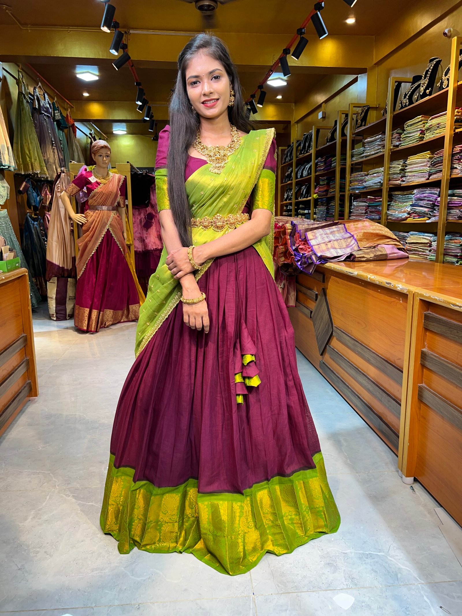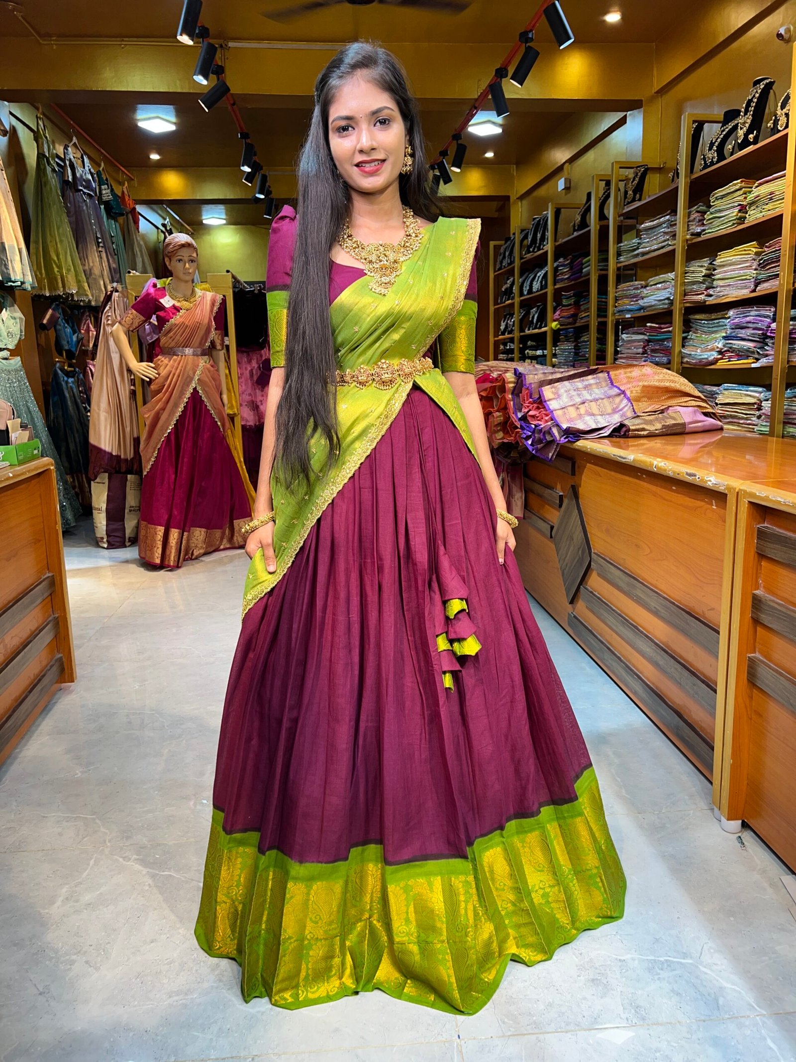 Be the first to review “Maroon with Mehendi Green Cotton Half Saree”
