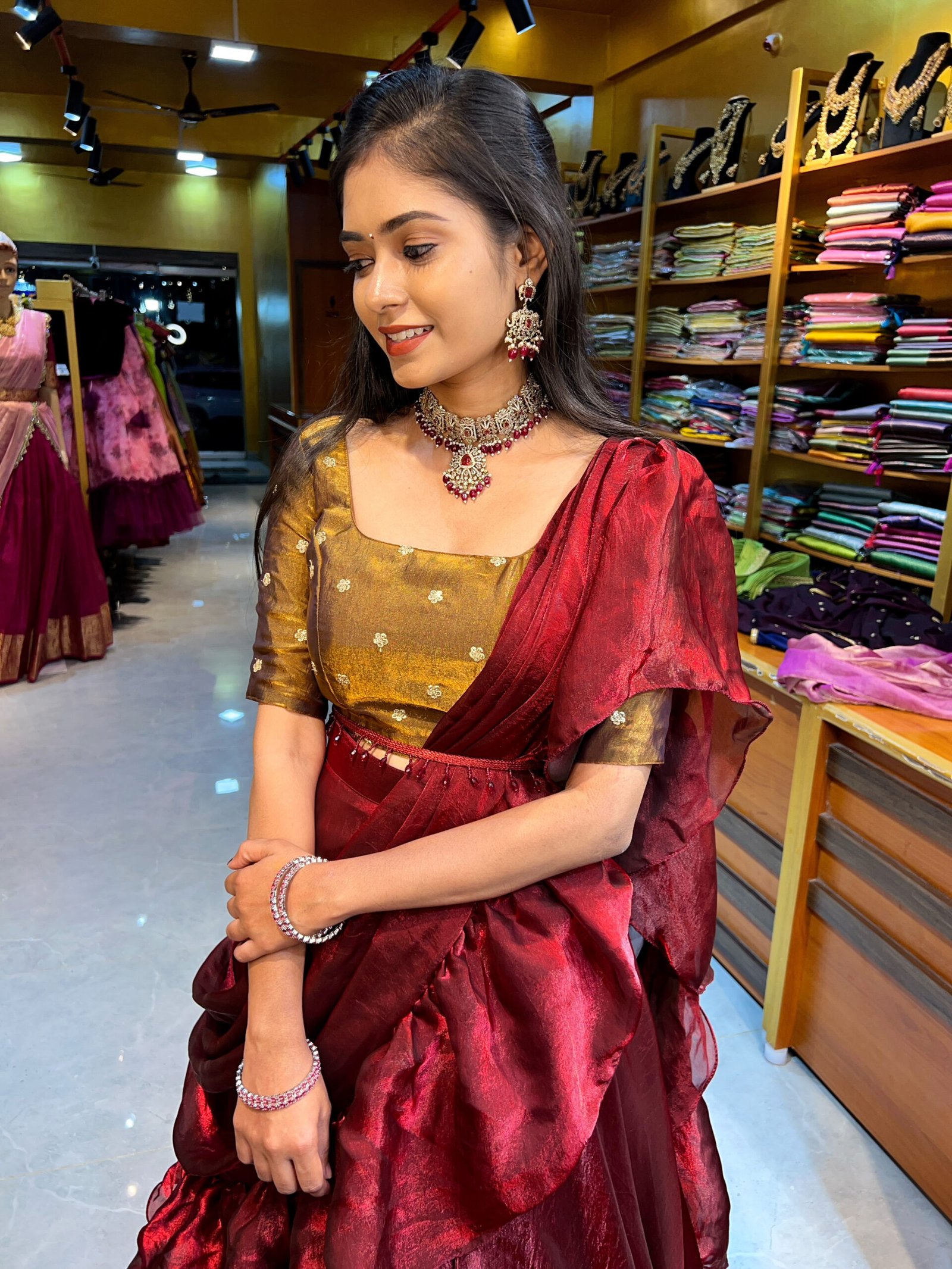 Be the first to review “Maroon With Metallic Gold Fendy Silk Lehenga”