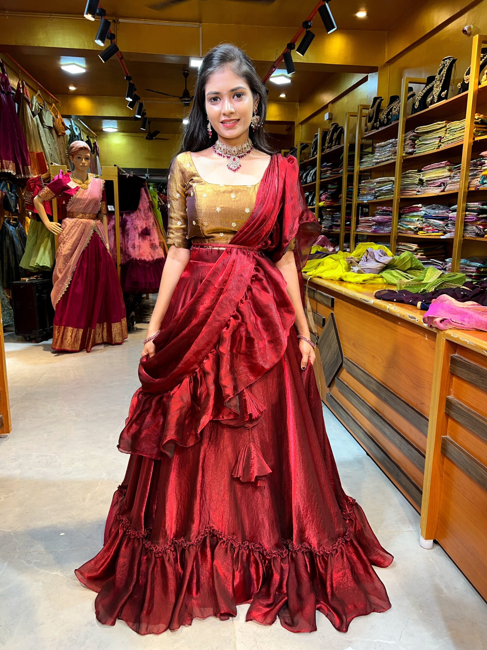 Lehenga : Maroon with Metallic Gold Fendy Silk Ruffled Skirt paired up with Contrast Butties blouse perfected with boutique tailoring