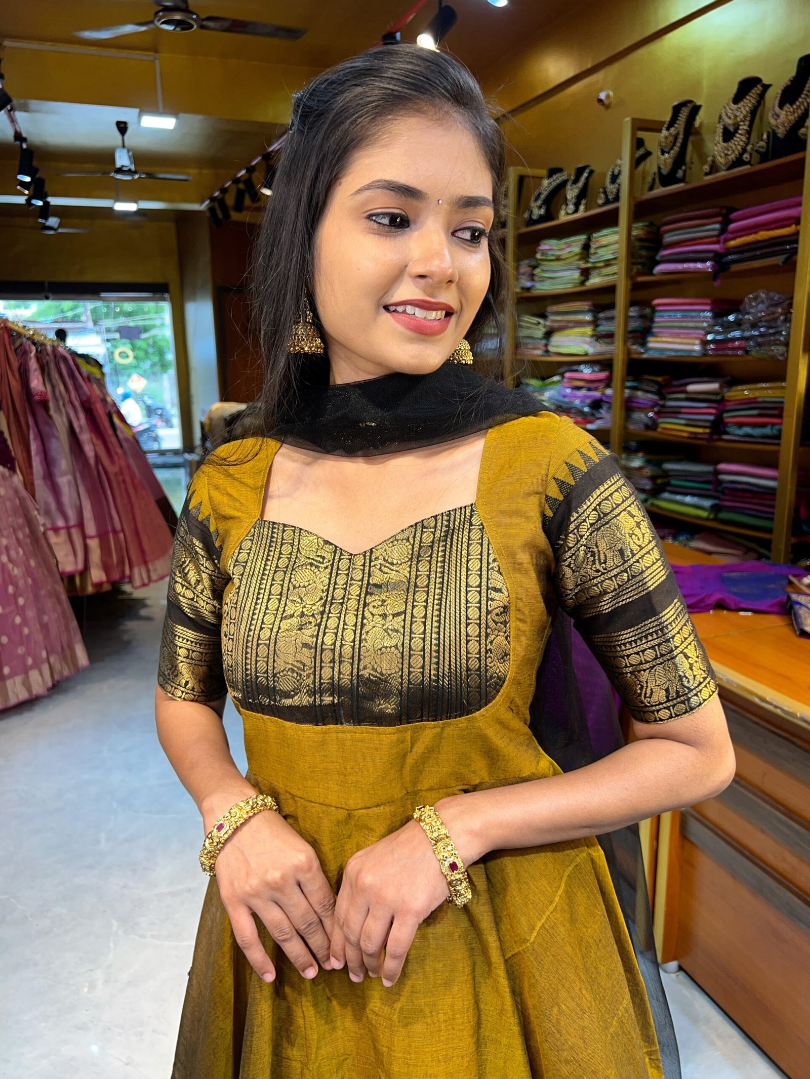 Anarkali : Mustard with Black Chettinad Anarkali.