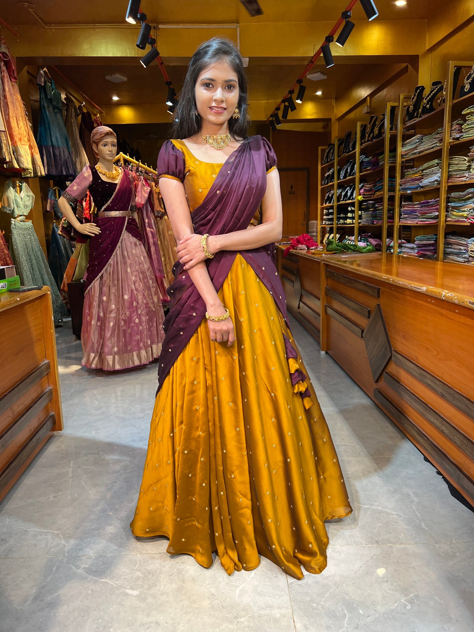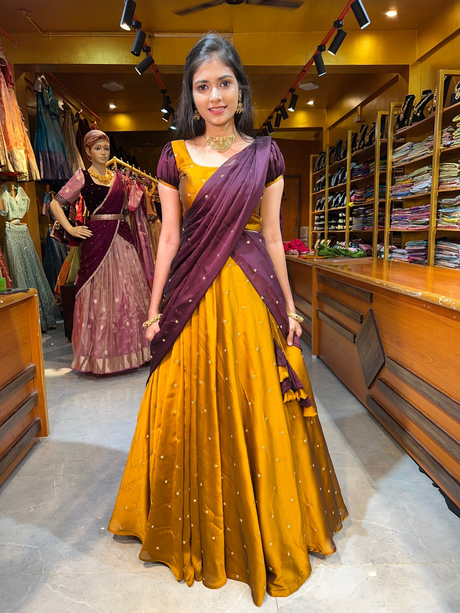 Be the first to review “Mustard Yellow with Coffee Silk Georgette half saree”
