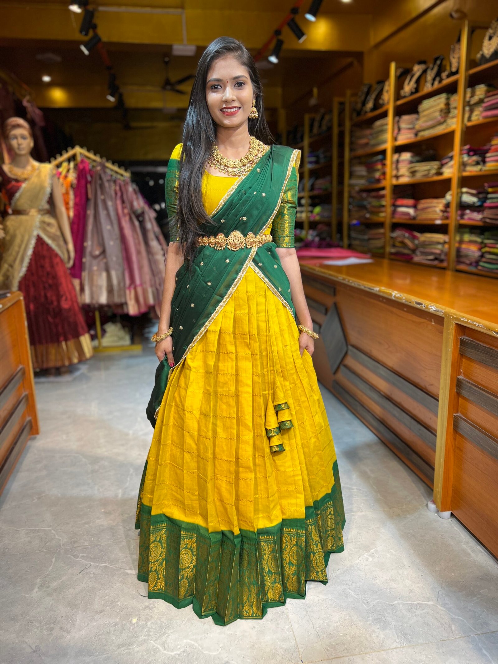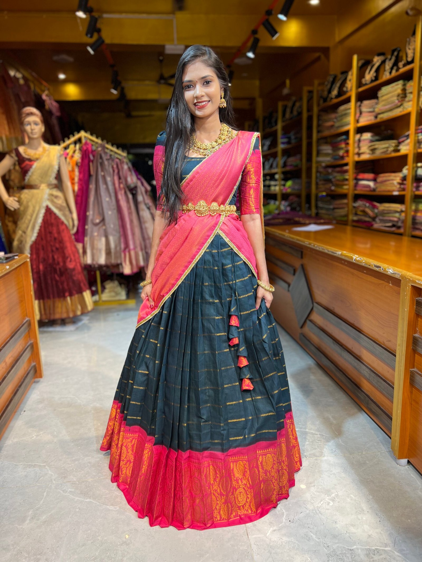 Lehenga : Navy Blue Handloom Sungudi cotton skirt with Kanchi border paired up with the Self blouse finished with boutique tailoring