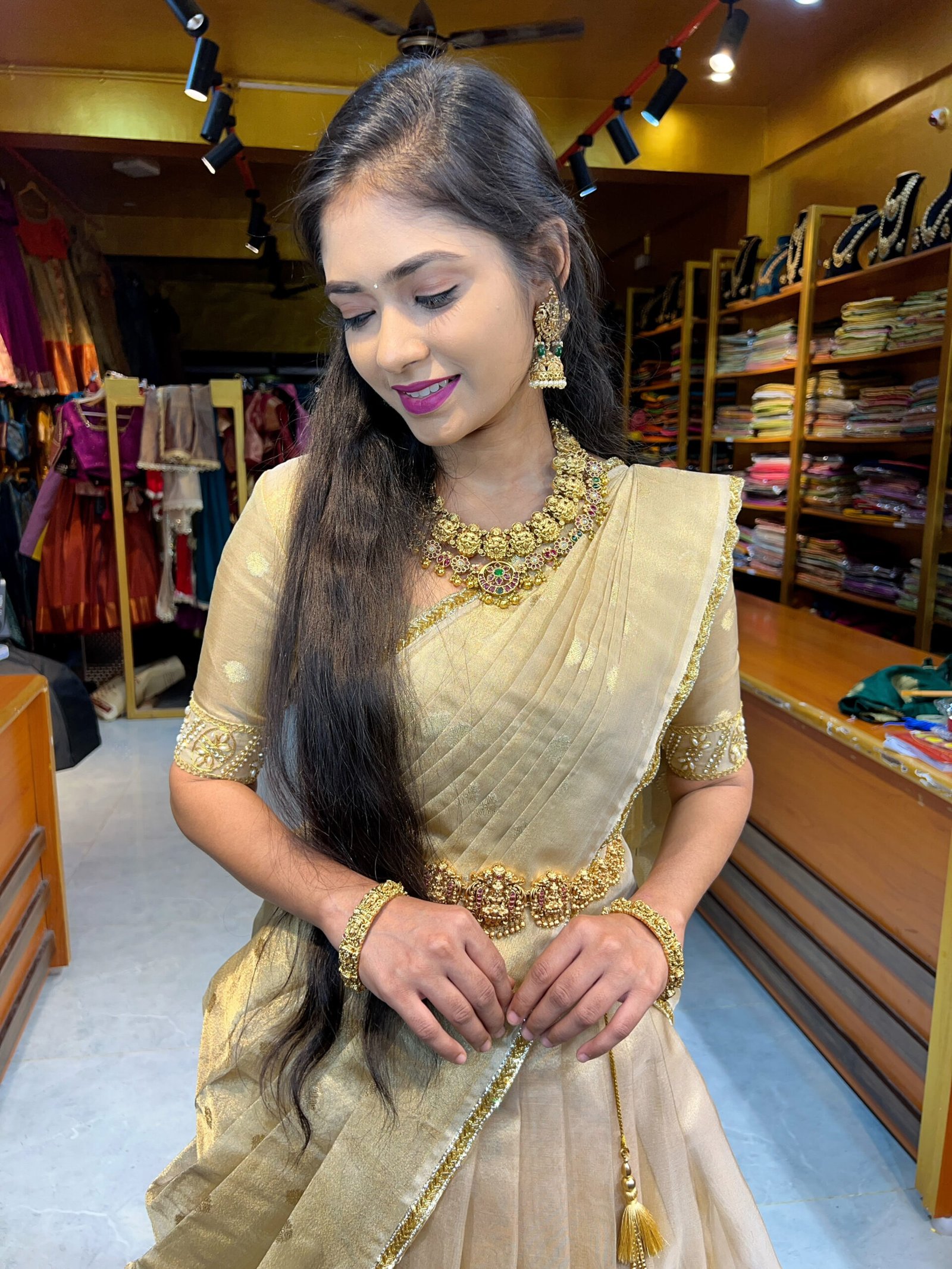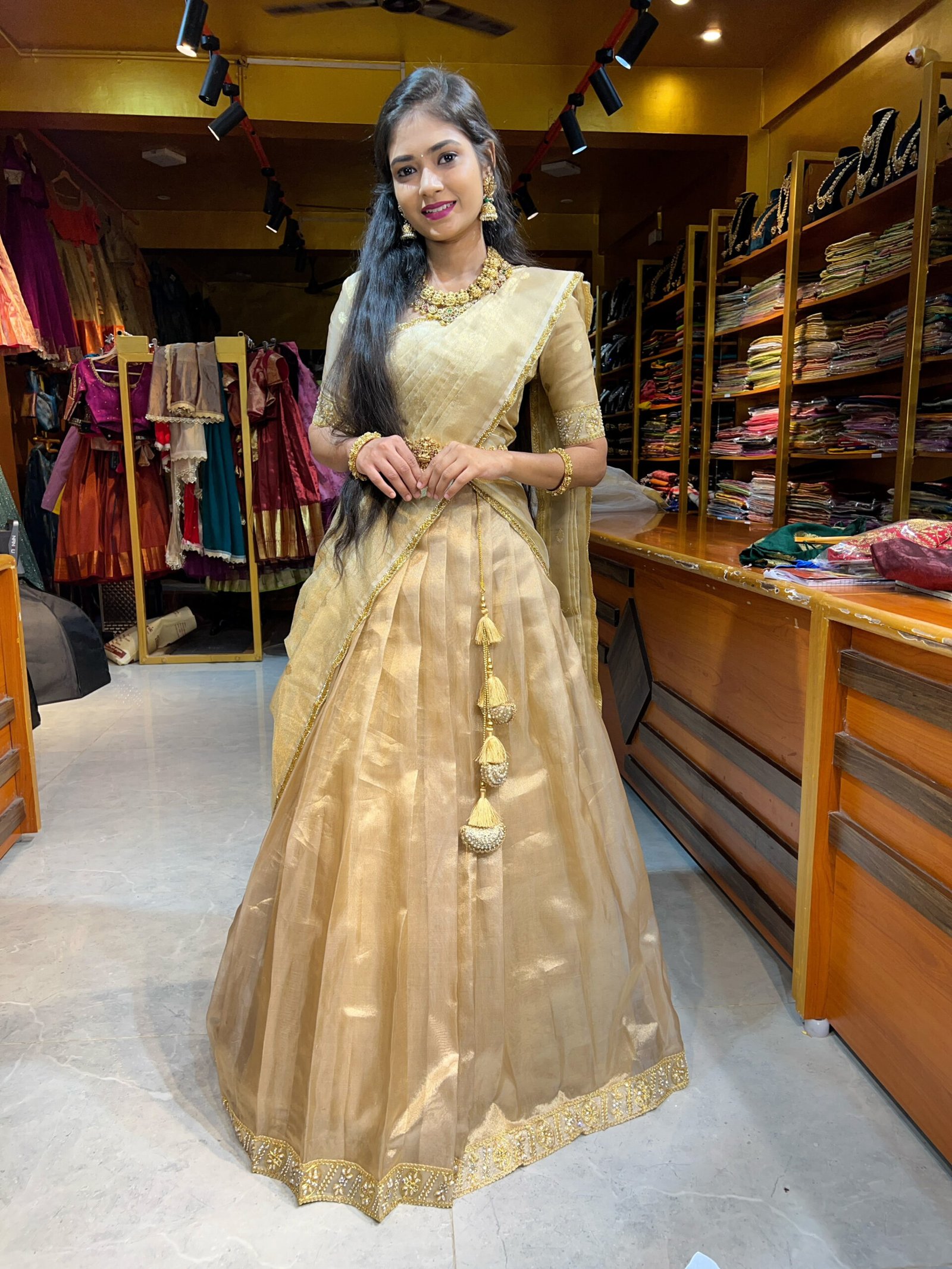 Lehenga : Gold beige tissue skirt with kanchi border paired up