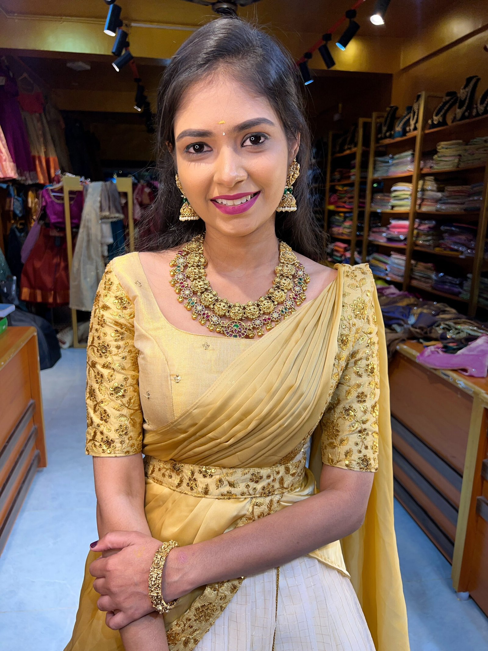 with the Contrast Gold Blouse finished with boutique tailoring