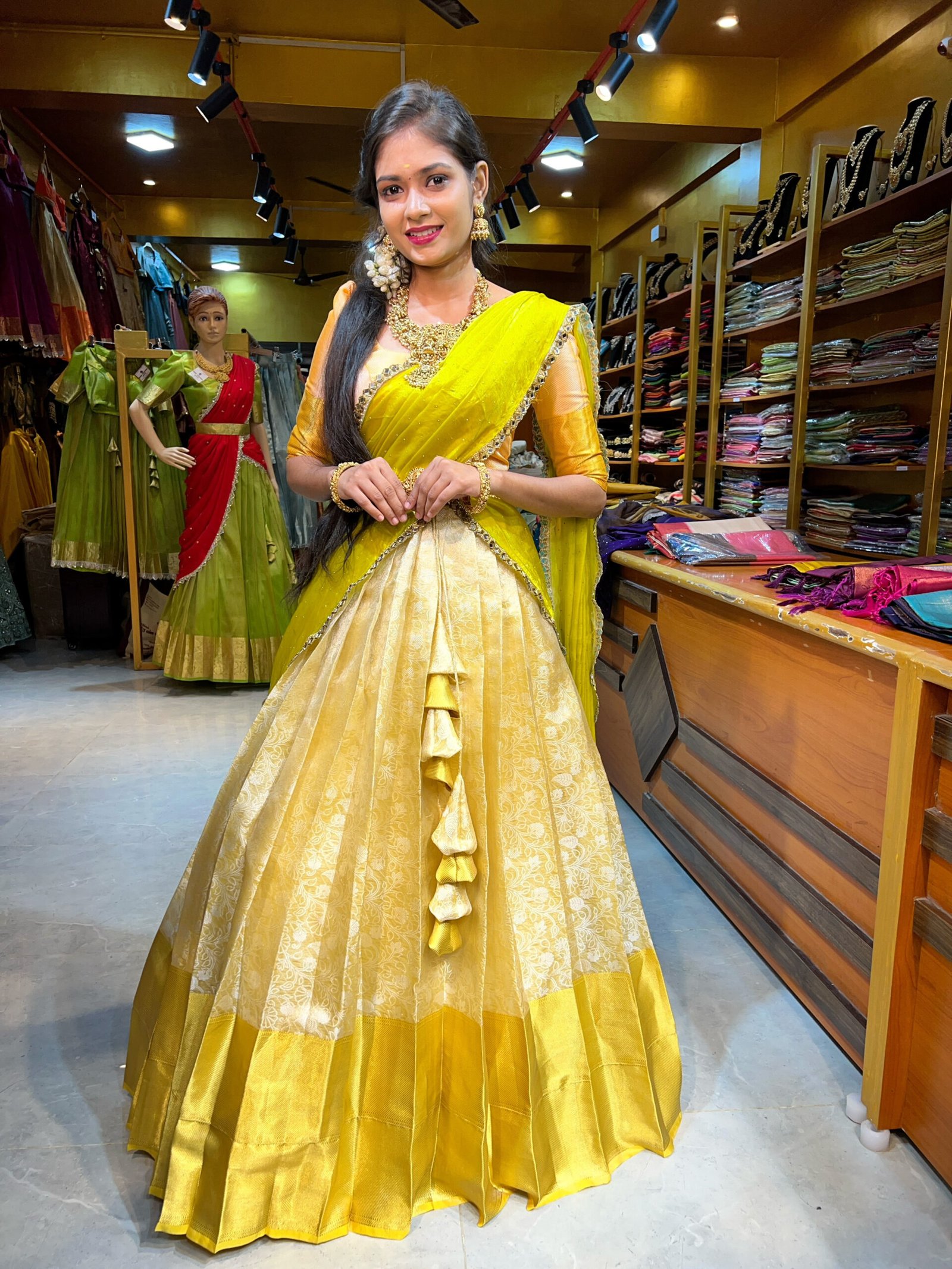 Lehenga :Off White Yellow Tissue skirt with kanchi border paired up with the Yellow Contrast Blouse finished with boutique tailoring