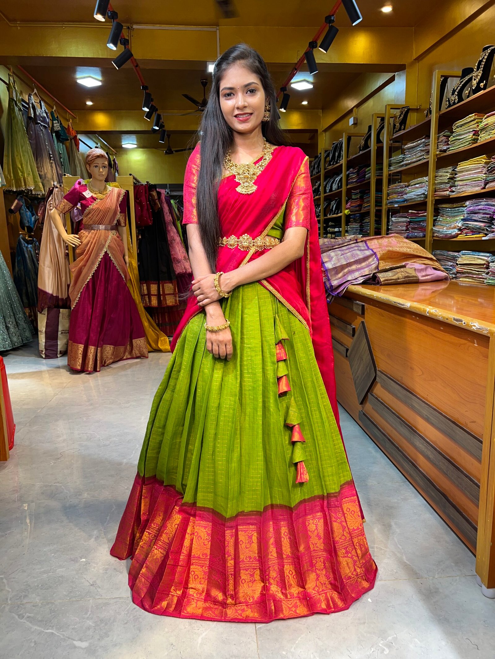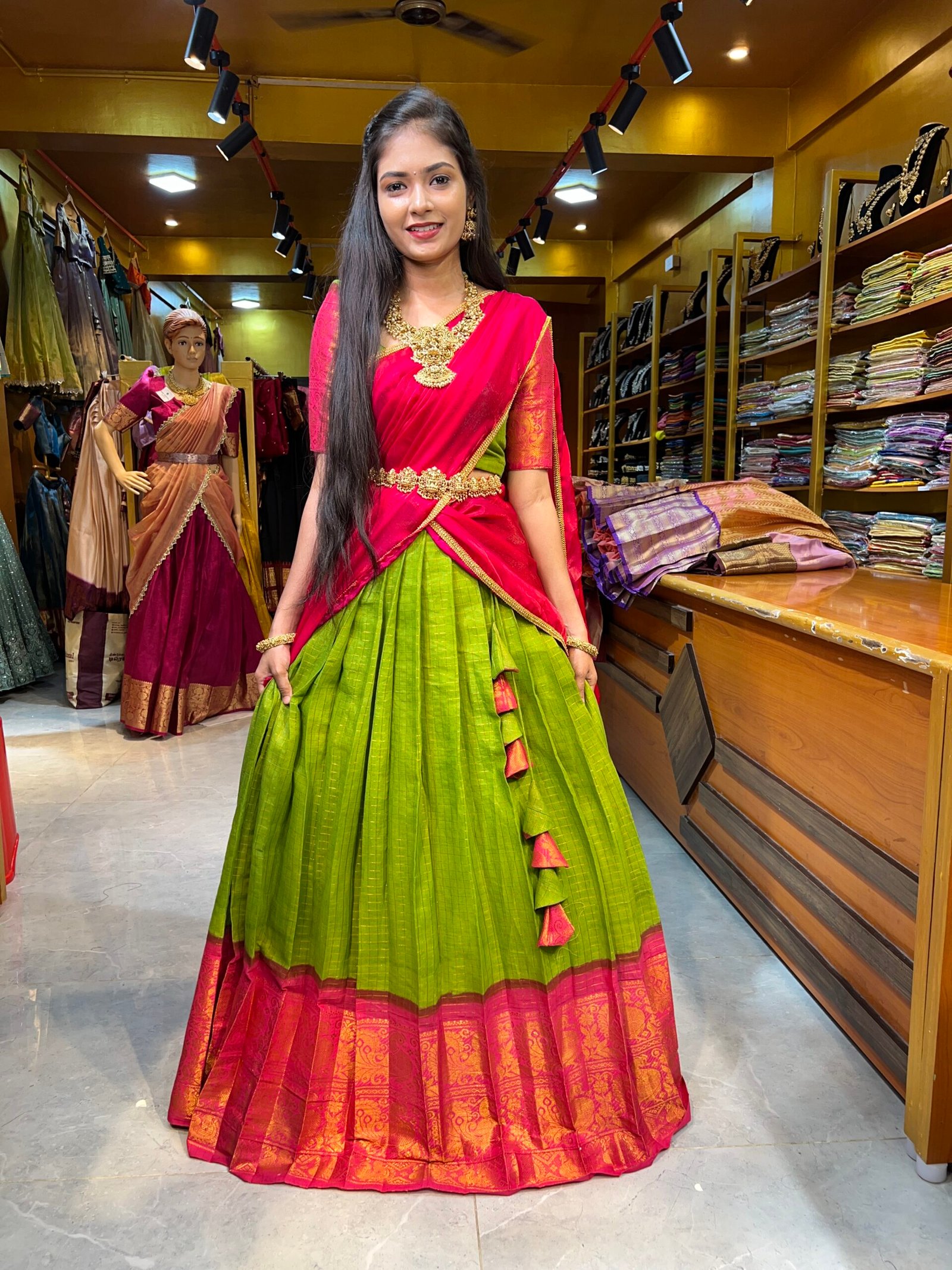 Parrot Green with Rani Pink Cotton Half Saree