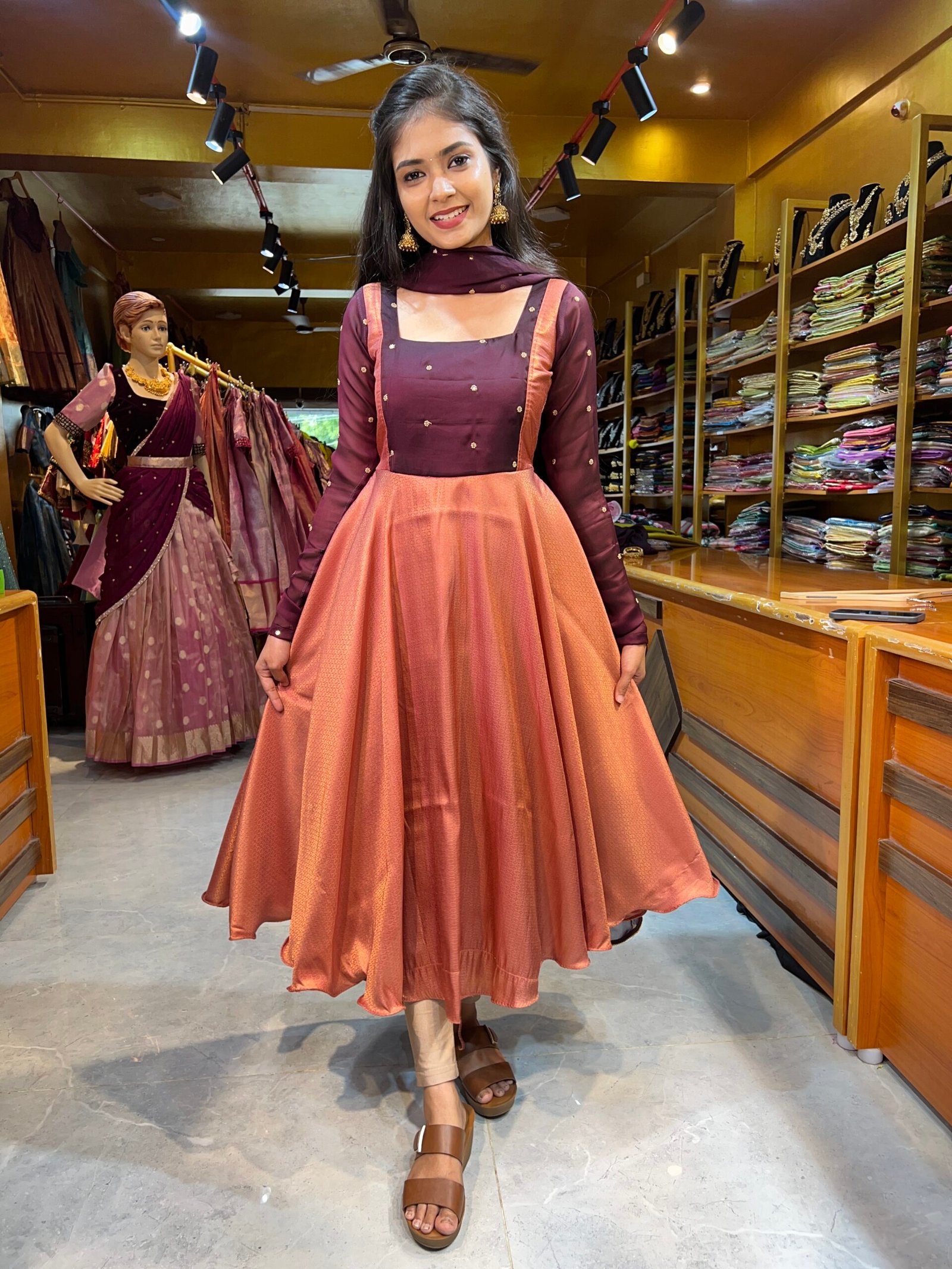 Anarkali : Peach Copper zari soft silk Anarkali paired up with Coffee silk georgette butti