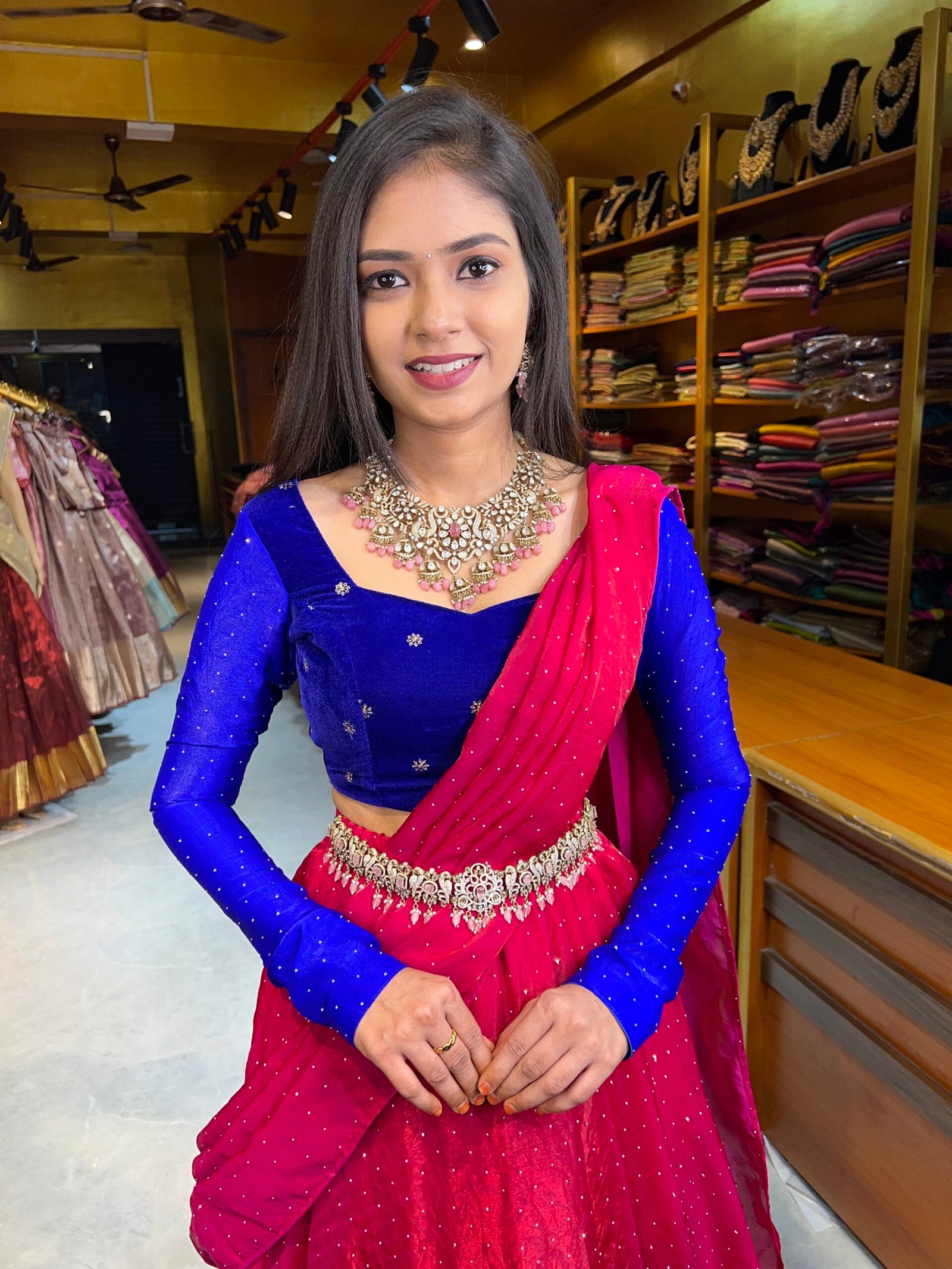 Top : Pepsi Blue Velvet paired up with with Fendy Rani Pink skirt perfected with boutique tailoring