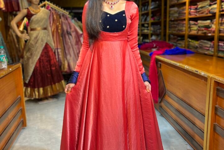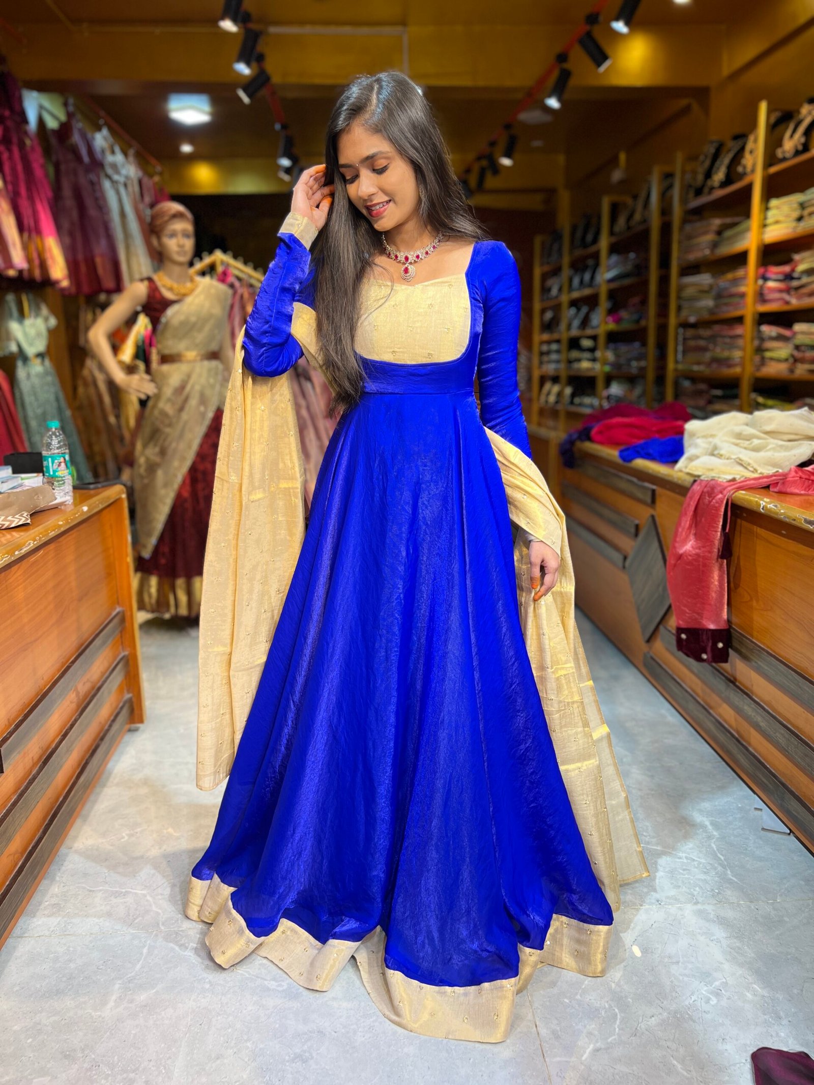 Maxi : Pepsi  Blue Space silk designer yoke part paired up with the space silk skirt perfected with boutique tailoring