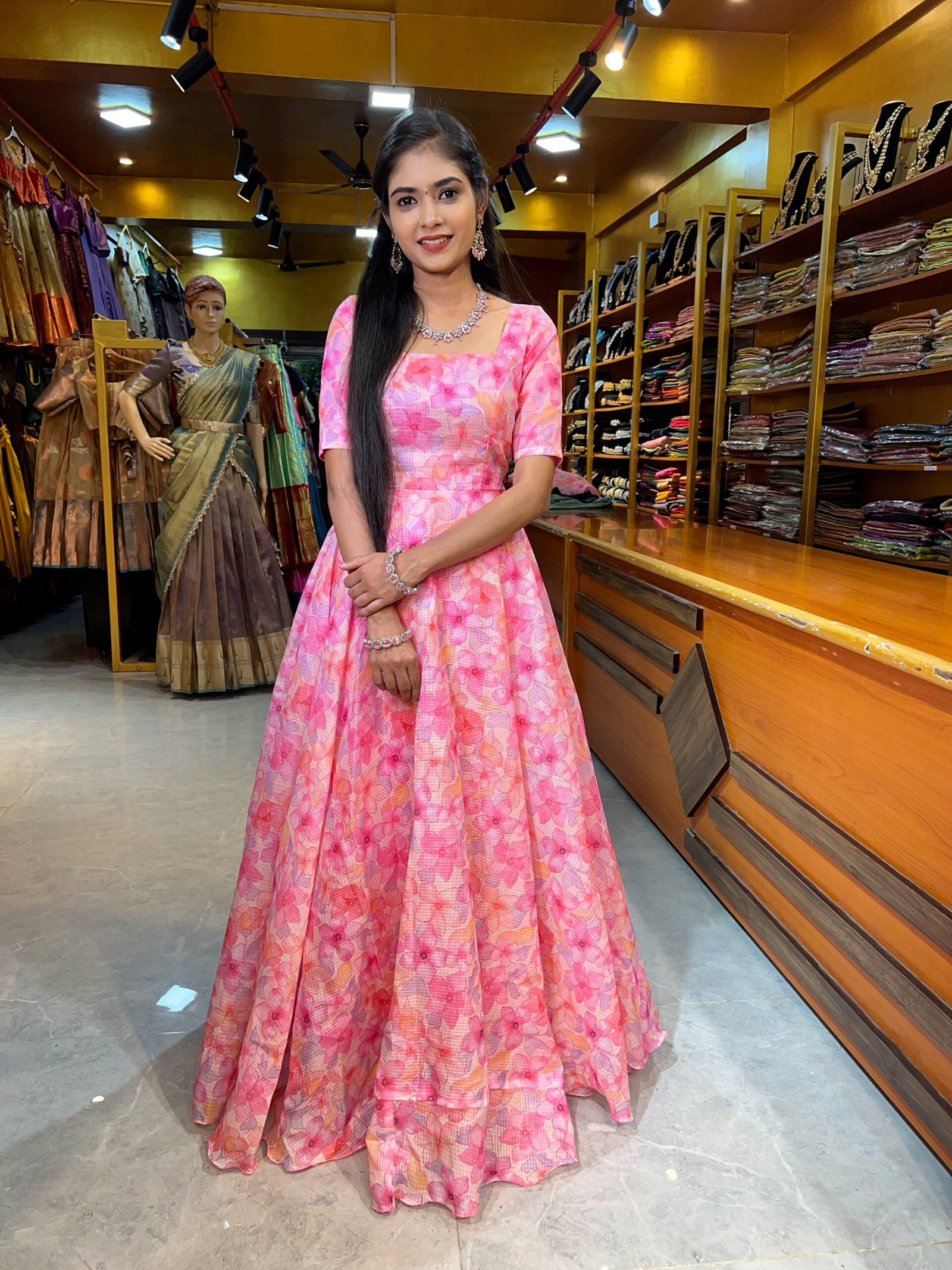 Be the first to review “Pink Floral Cotton Kota Gown”