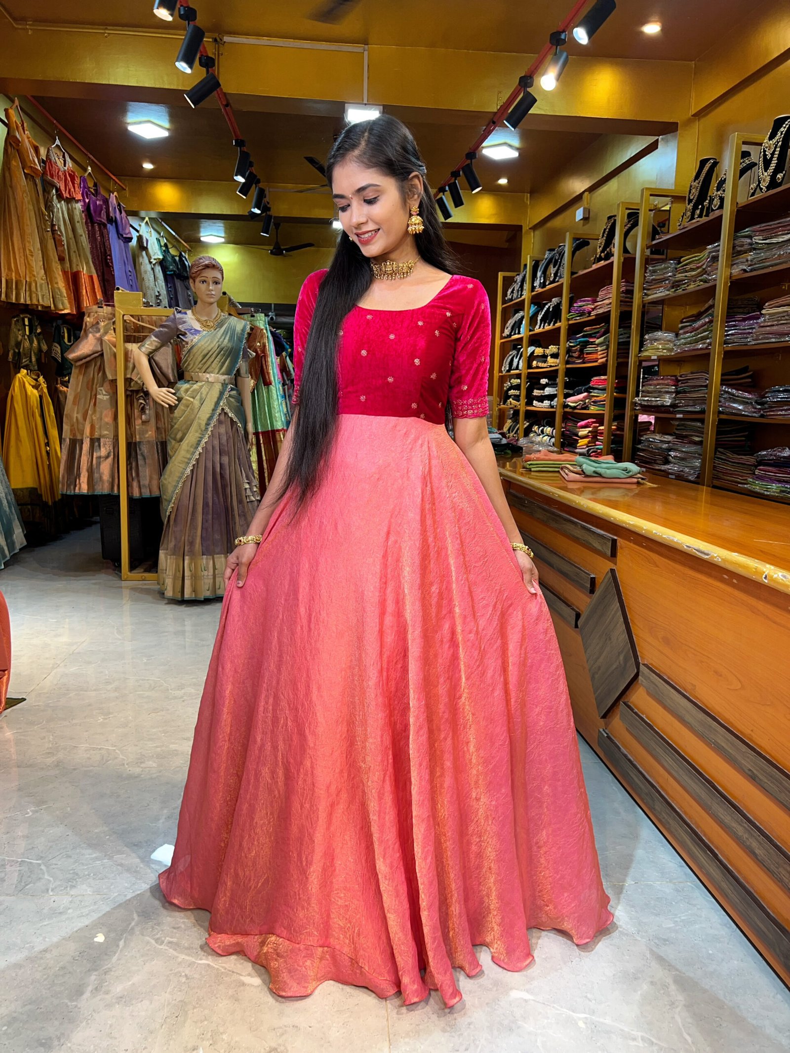 Be the first to review “Rani Pink Velvet with Peach Crushed Silk Gown”