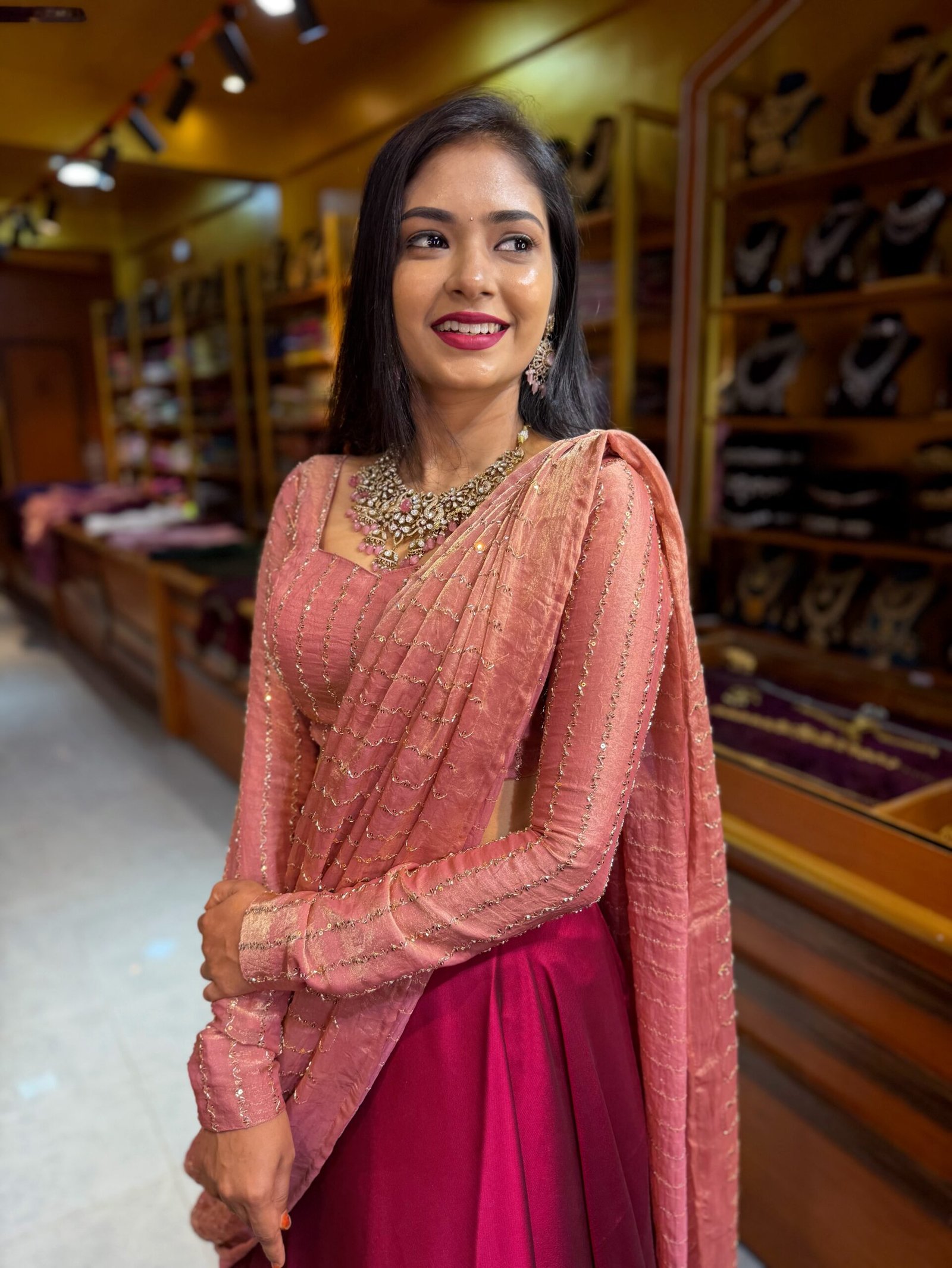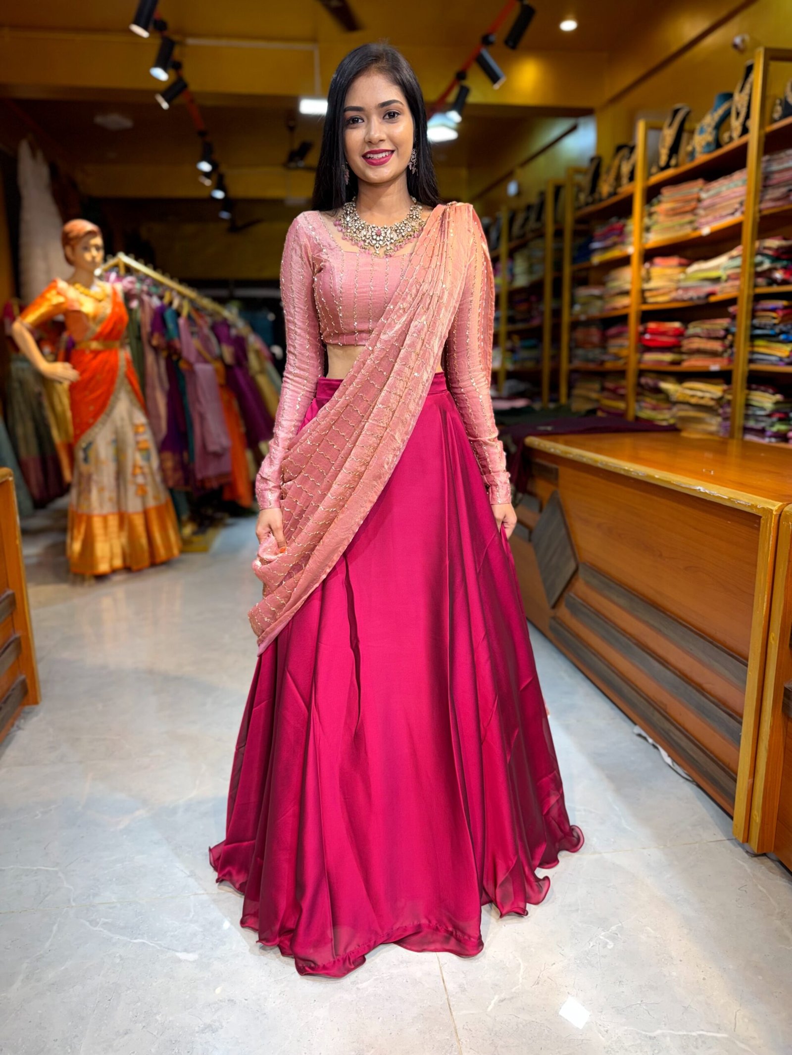 Lehenga : Wine Fendy Silk Skirt paired up with Contrast Rose Gold Blouse perfected with boutique tailoring