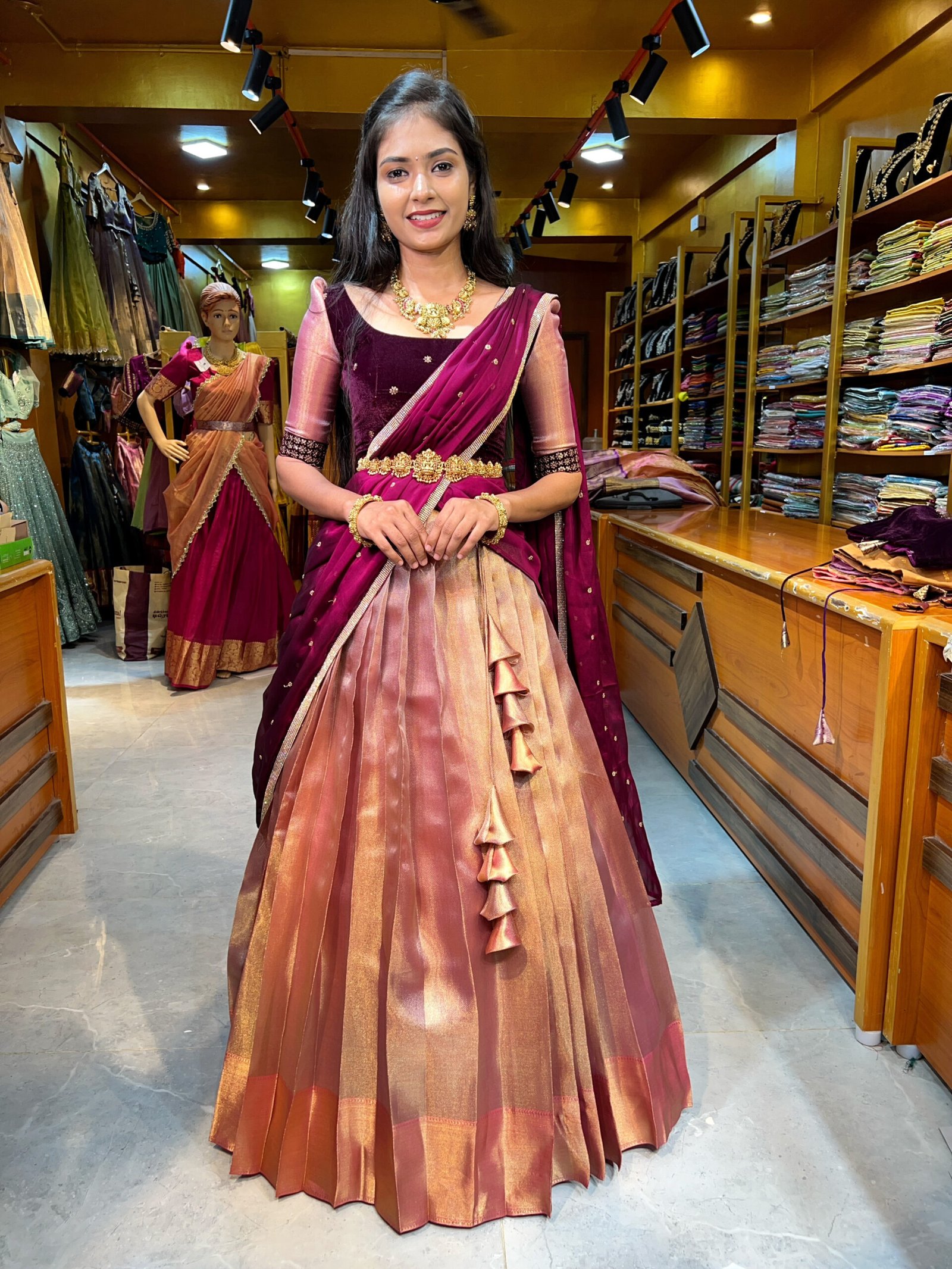Rose Gold with Wine Velvet Half Saree