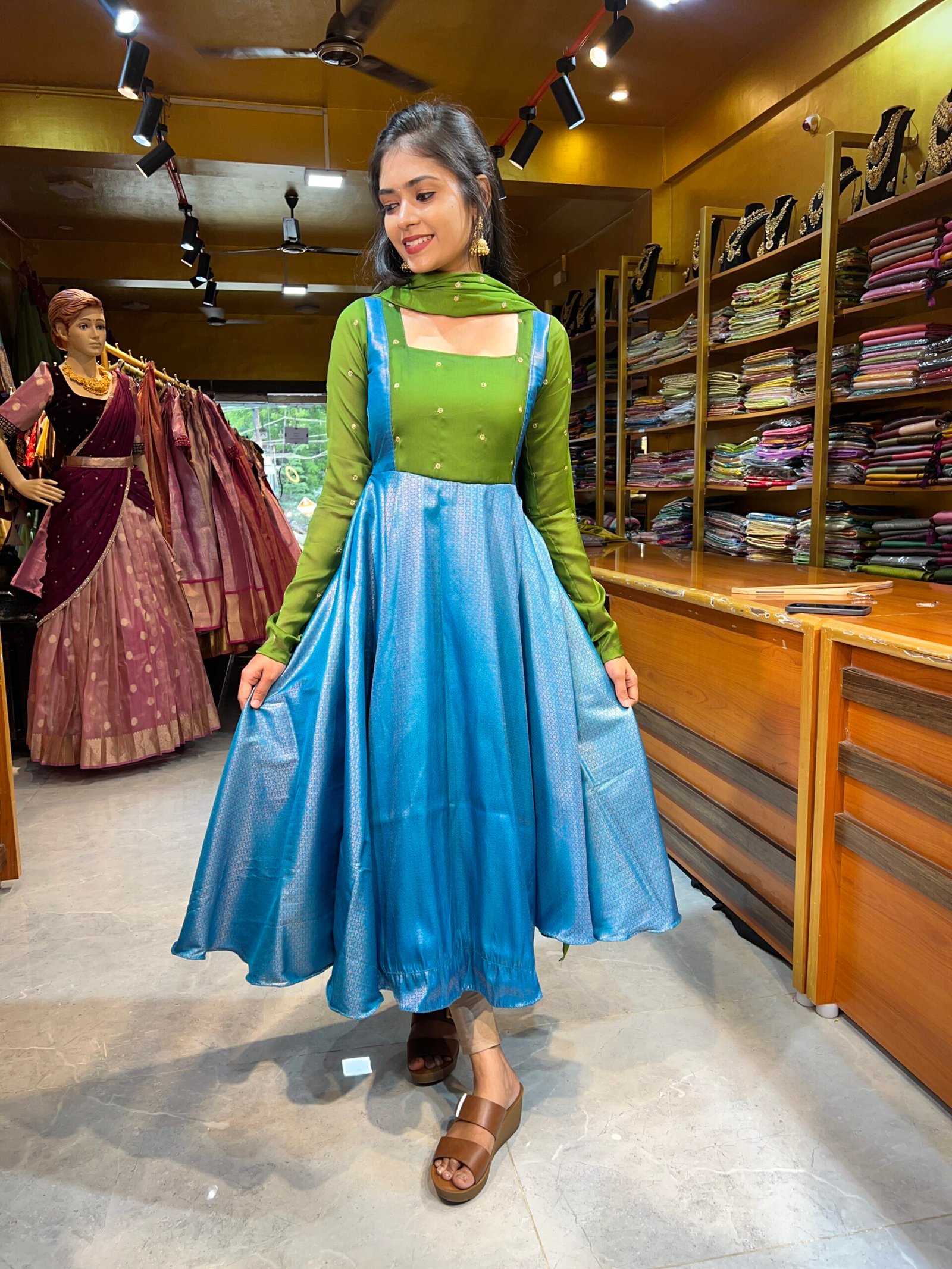 Anarkali : Royal Blue Copper zari soft silk Anarkali paired up with Parrot Green silk georgette butti