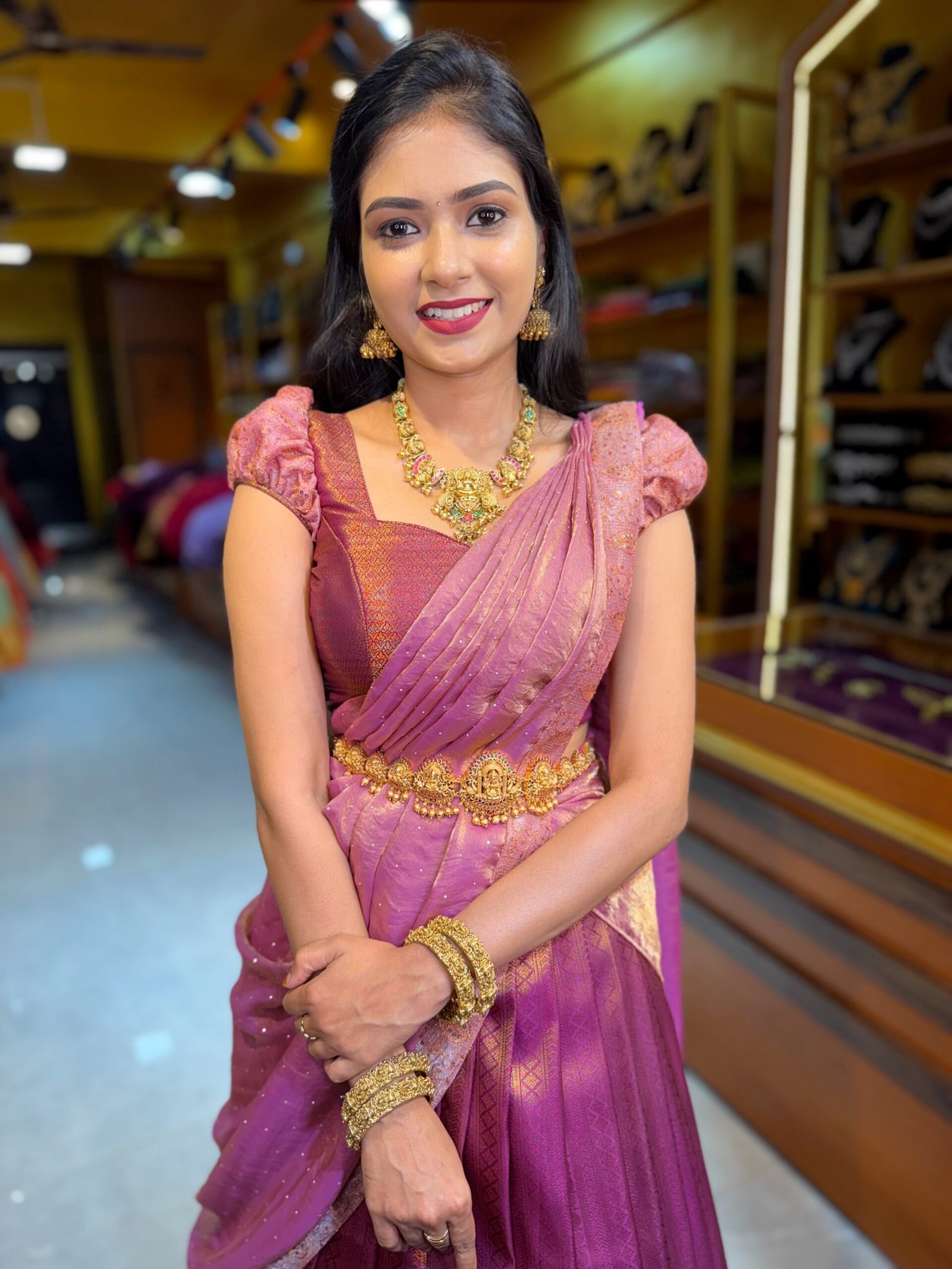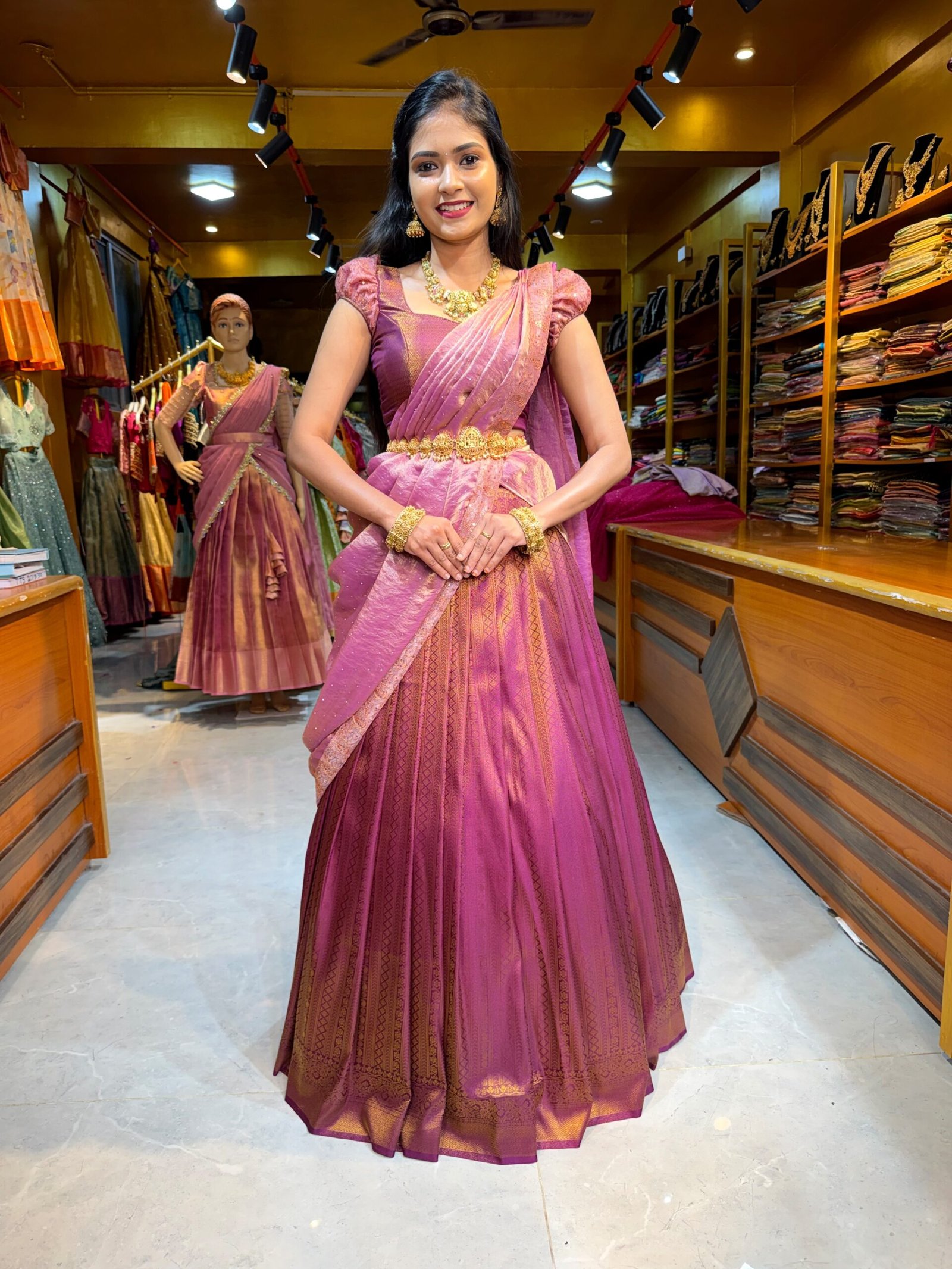 Be the first to review “Wine with Rose Gold copper zari half saree”