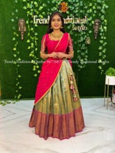 ₹4,450.00Half saree : Sea Green soft silk Banras skirt paired up with Self blouse perfected with boutique tailoring Dupatta : Red Silk Georgette dupatta with…